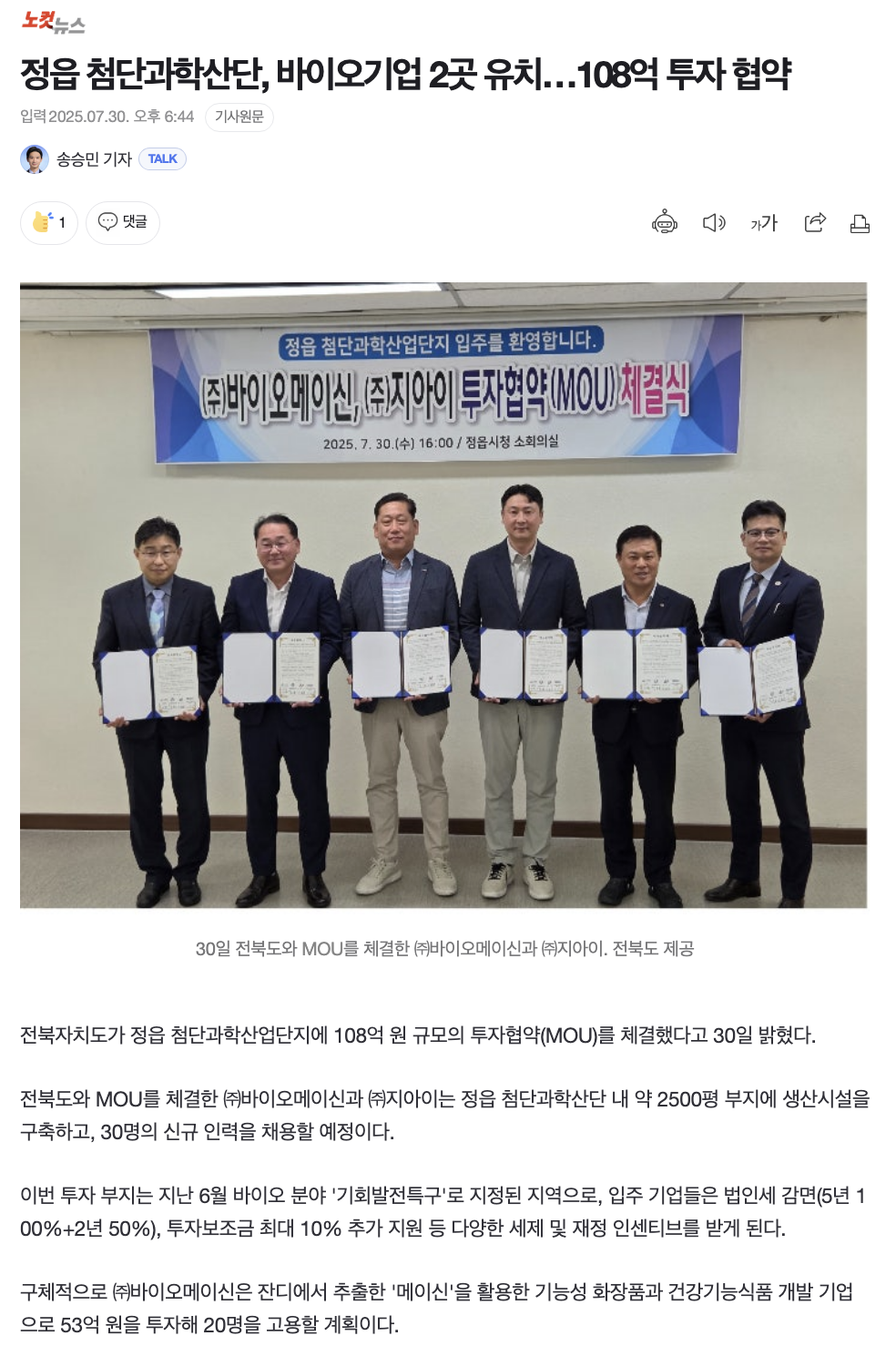 정읍 첨단과학산단, 바이오기업 2곳 유치…108억 투자 협약