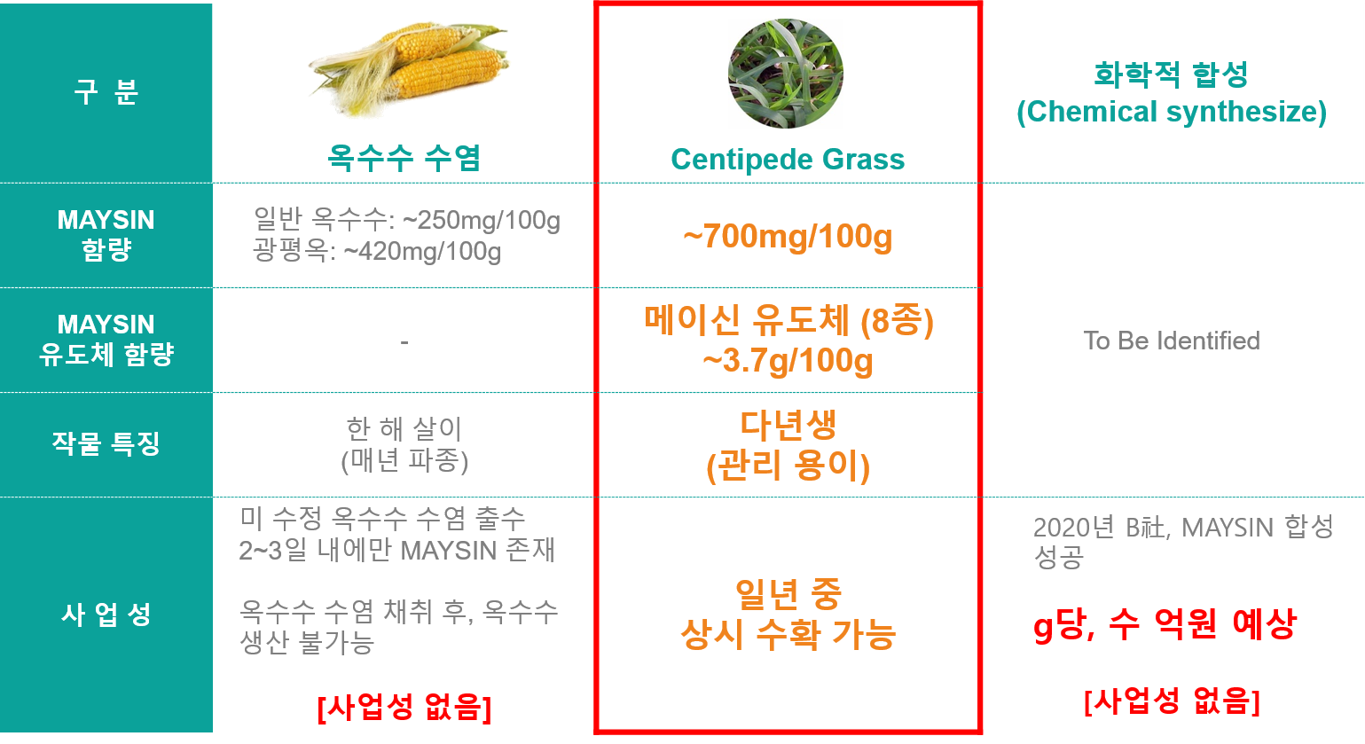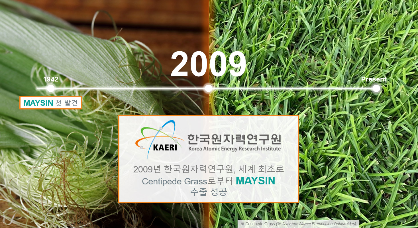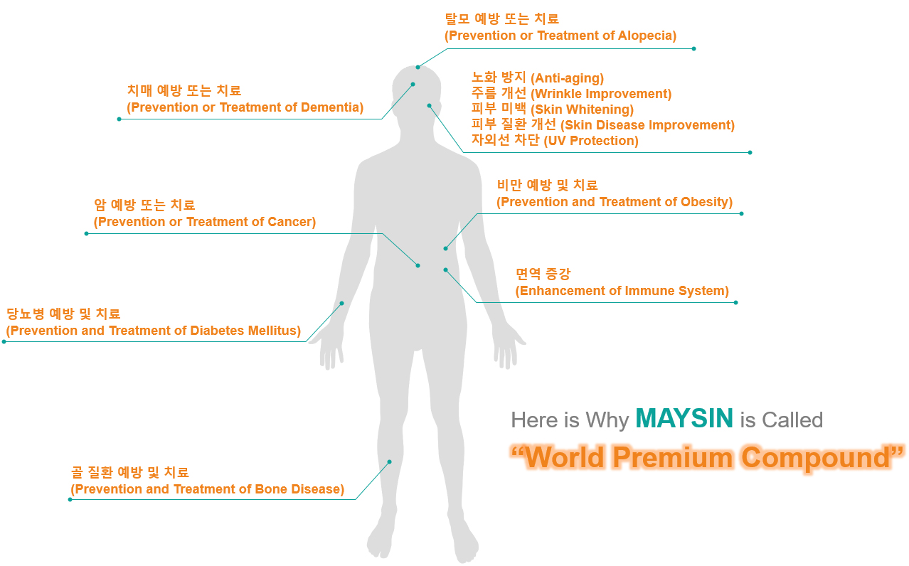 MAYSIN은 천연 플라보노이드 화합물 (Natural Flavonoid Compound)로서, 플라보노이드 (Flavonoid)는 항산화 및 항염증 특성으로 인해 건강 증진에 유익한 영향을 미치는 식물 기원 화합물