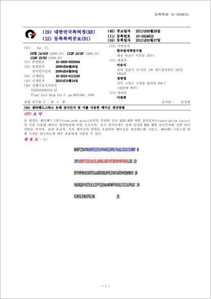 [특허 1] 센티페드그라스 유래 전사인자 및 이를 이용한 메이신 생산방법