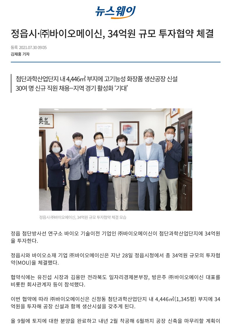 정읍시·㈜바이오메이신, 34억원 규모 투자협약 체결
