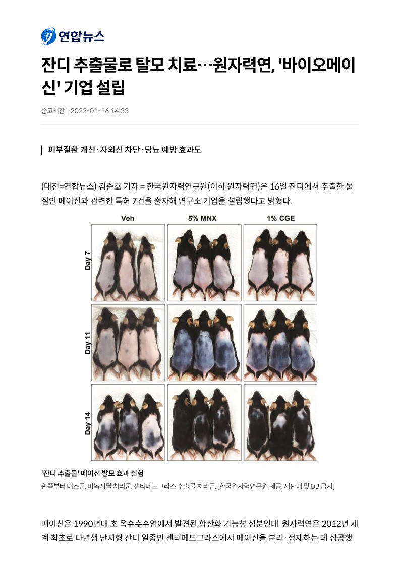 잔디 추출물로 탈모 치료…원자력연, '바이오메이신' 기업 설립