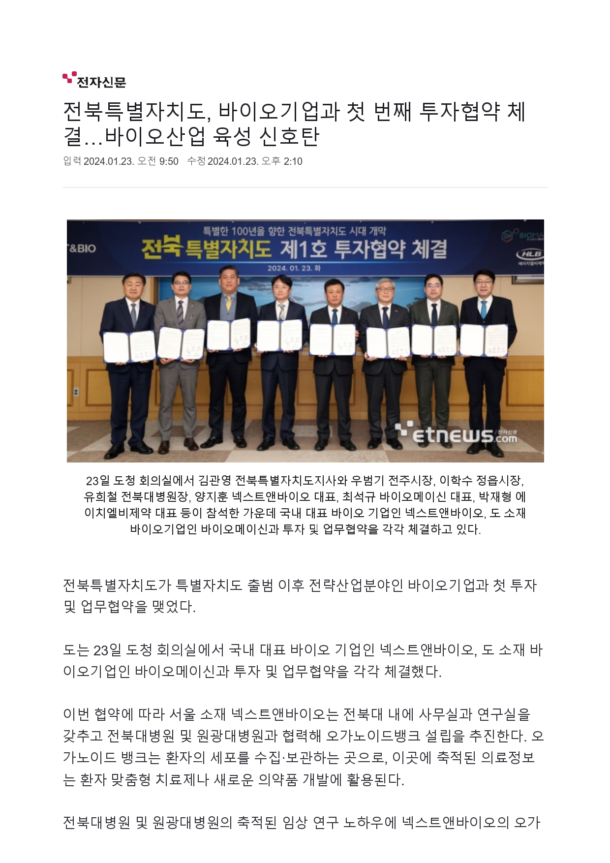 전북특별자치도, 바이오기업과 첫 번째 투자협약 체결…바이오산업 육성 신호탄